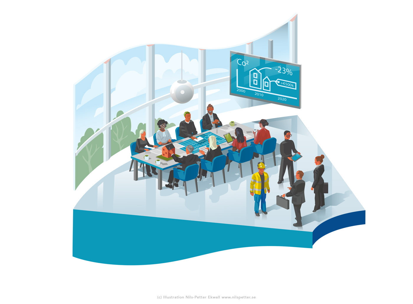 Nils-Petter was commissioned by CarveSthlm to make an illustrated circular motion diagram for Consolis - where each pie slice would be like a miniature world or scene; showing the company's value chain from initial discussions with partners, to innovation and design, to responsible material sourcing, manufacturing, transportation and construction of buildings and infrastructure to a sustainable society. The different illustration parts had to work as stand alone illustrations and together as one circular chart, scalable to any size without distortion.