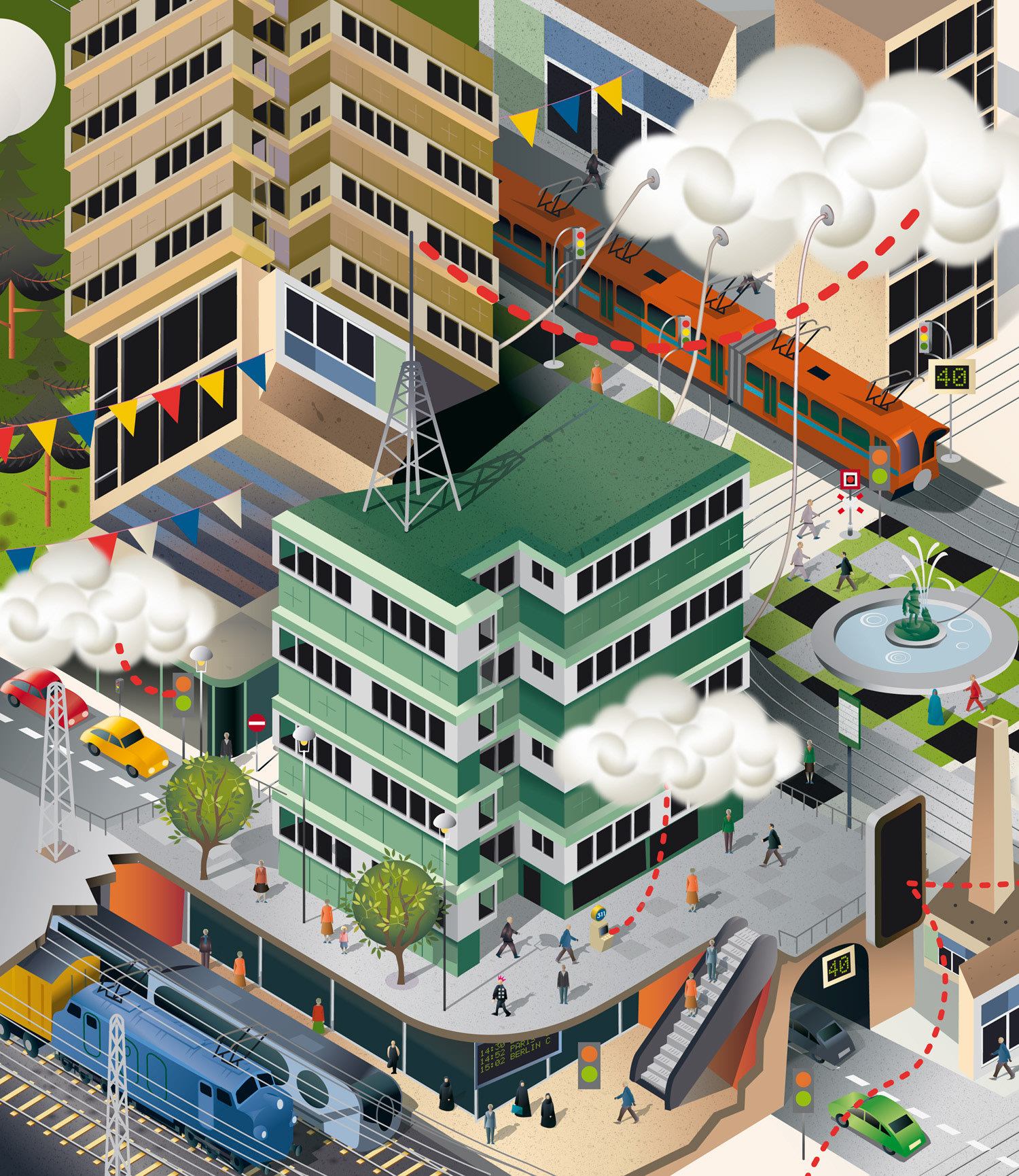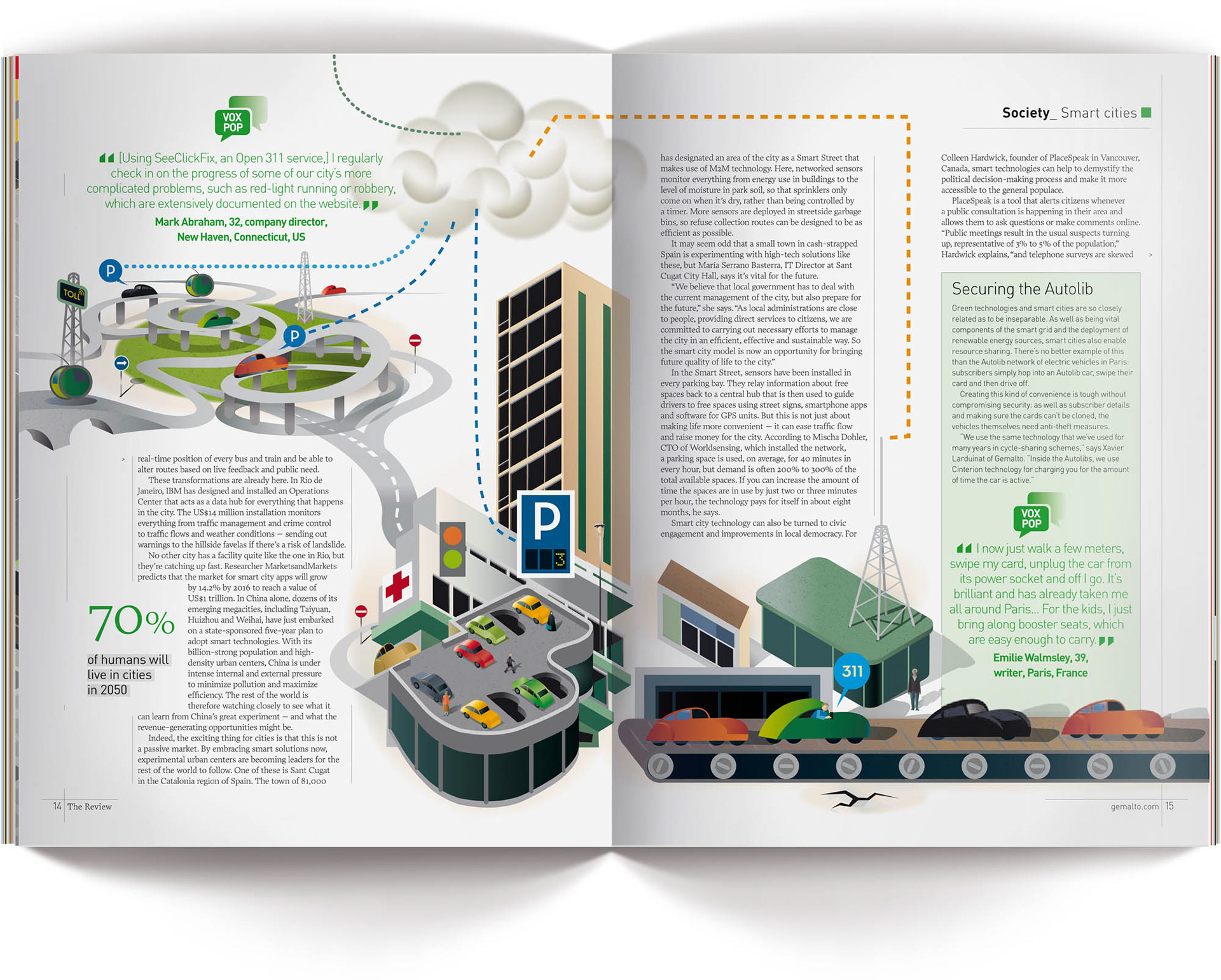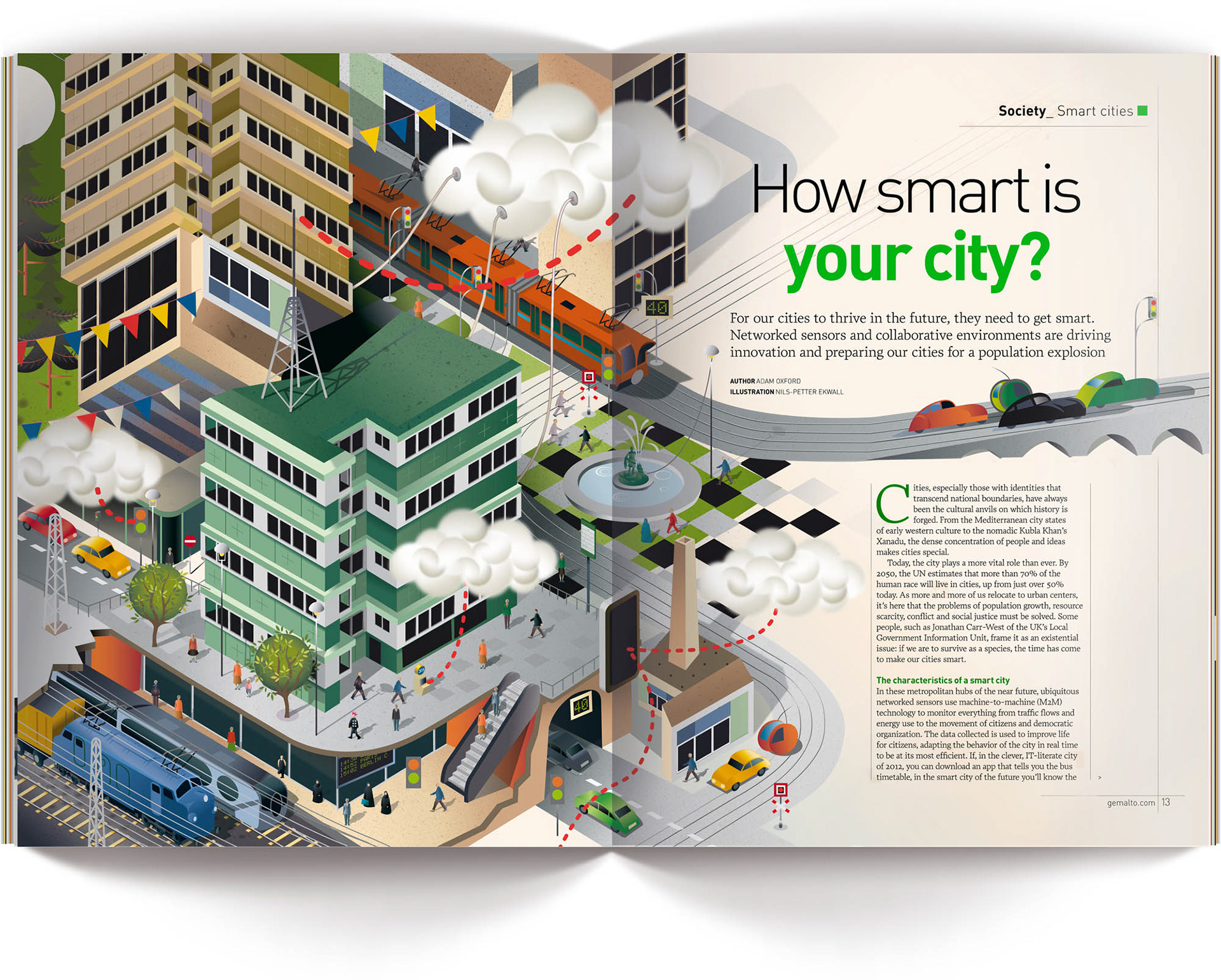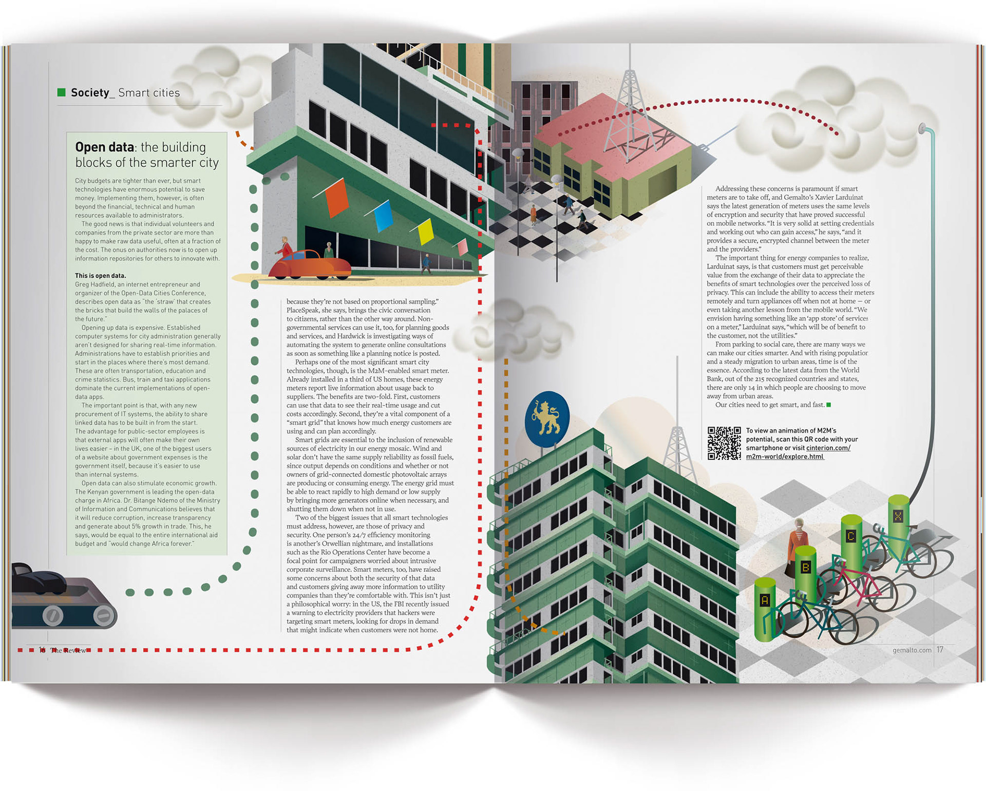 Illustrations for Gemalto's The Review Magazine and an article about M2M (Machine to Machine) technology, making Cities greener, more efficient and better connected.