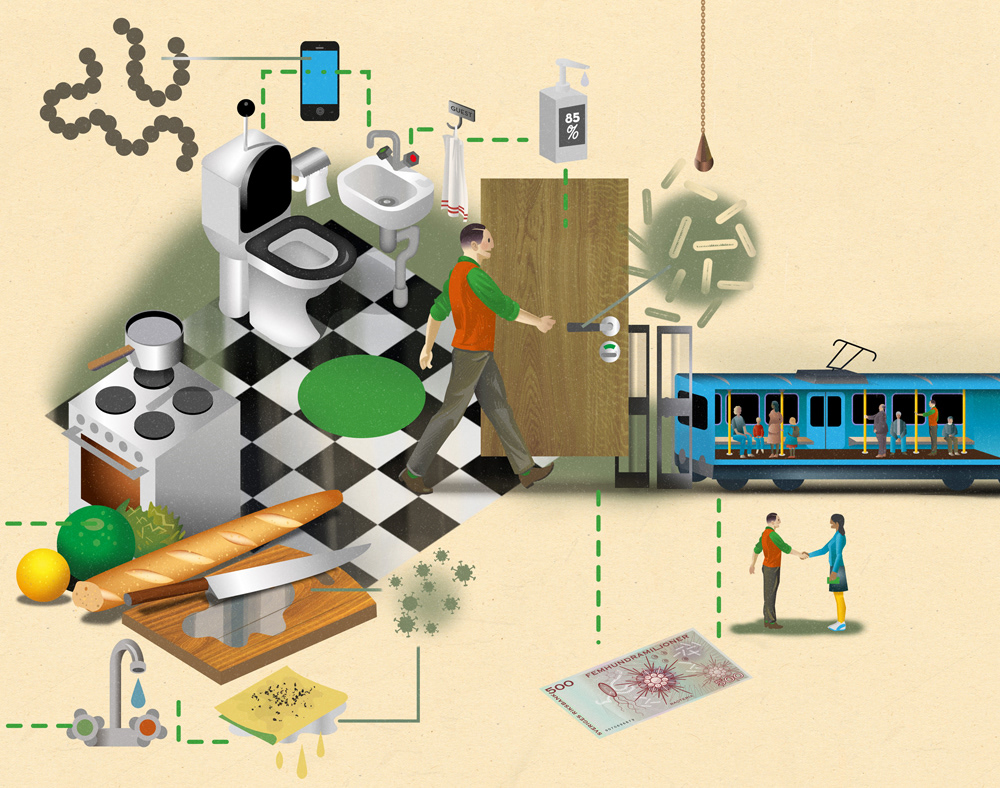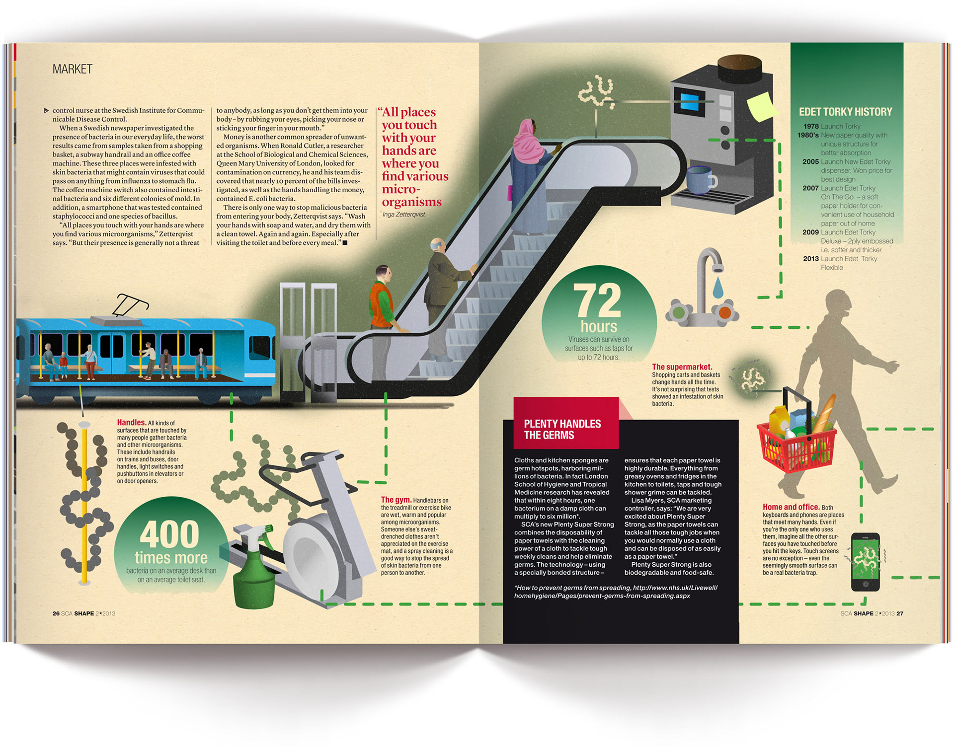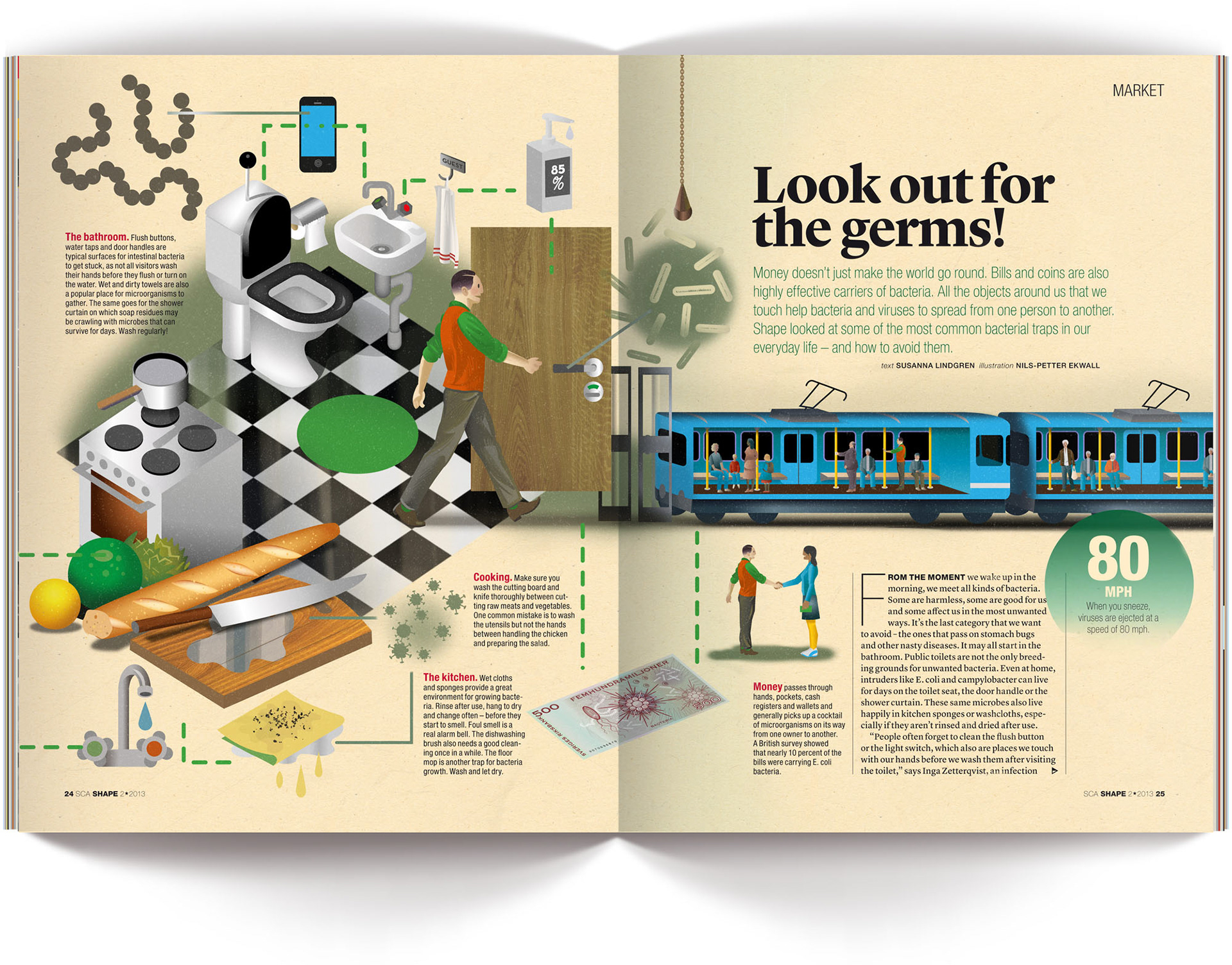 Illustration for an article on hand hygiene for Shape Magazine from SCA. (SCA produces personal care products, tissues, toilet paper and forest products; paper, pulp and wood components.)