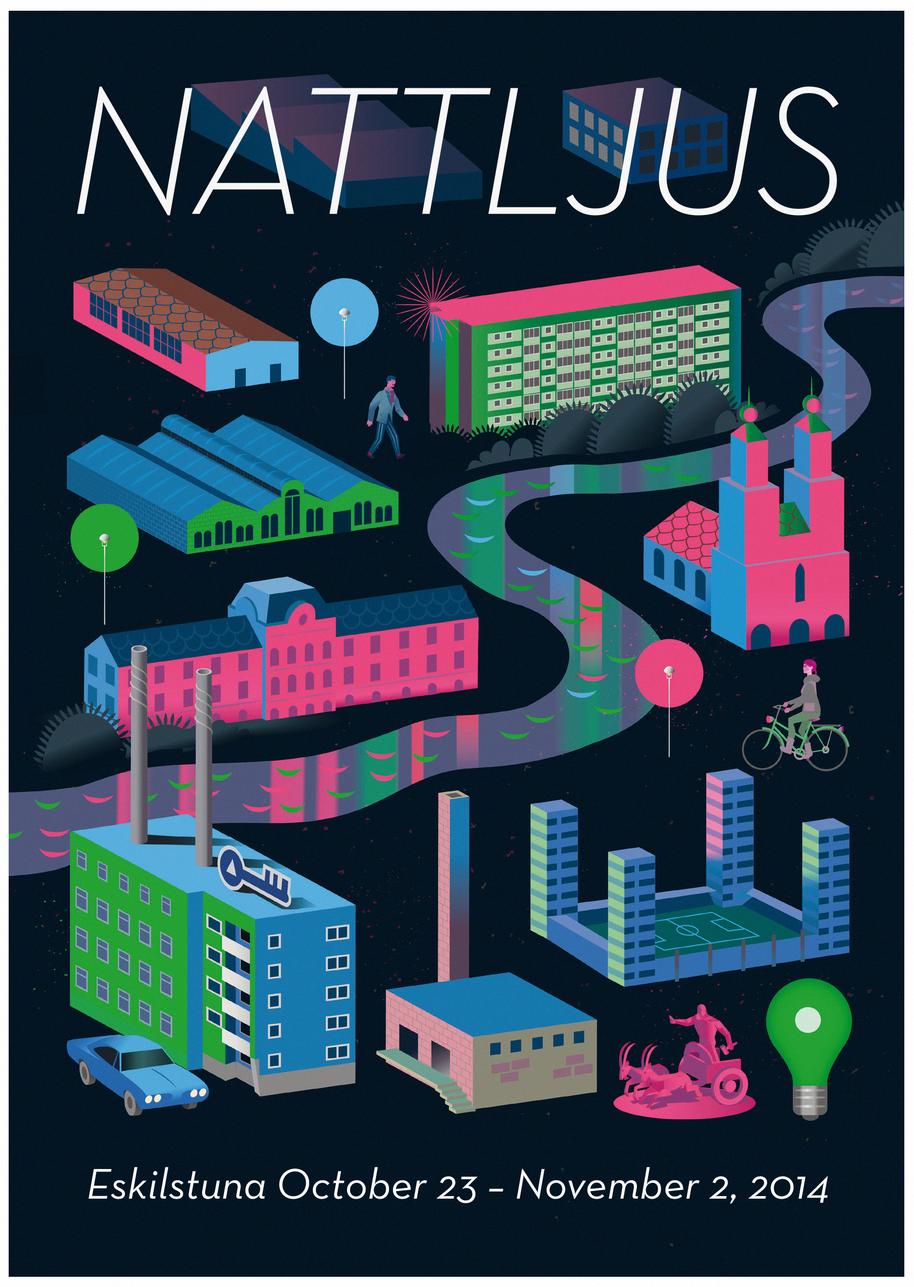 was commissioned by City of Eskilstuna to produce this poster and illustration for the 2014 Nattljus Light festival. The illustration contains well known buildings and landmarks in Eskilstuna.
