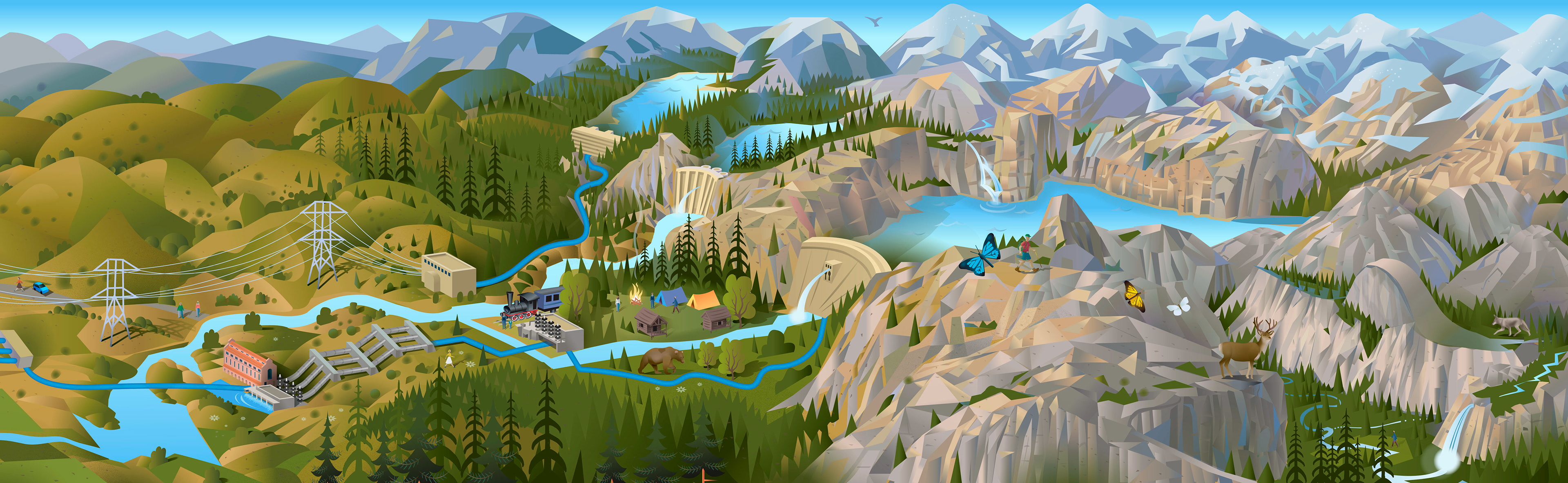 Snowfall to Outfall - Illustration for a 58' long and 4' tall interactive digital arts panorama at the San Francisco Public Utilities Commission headquarters. The San Francisco Public Utilities Commission (SFPUC) is a public agency of the City and County of San Francisco that provides water, wastewater, and electric power services to the City and an additional 1.6 million customers within three San Francisco Bay Area counties. The illustration shows SFPUC's water transport facilities - from rainwater and glaciers in the mountains to Hetch Hetchy Reservoir, Lake Eleanor and Lake Floyd in Yosemite National Park, water is transported through 167 miles of pipelines and tunnels systems through Central Valley to Bay Area and the Pacific Ocean.