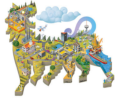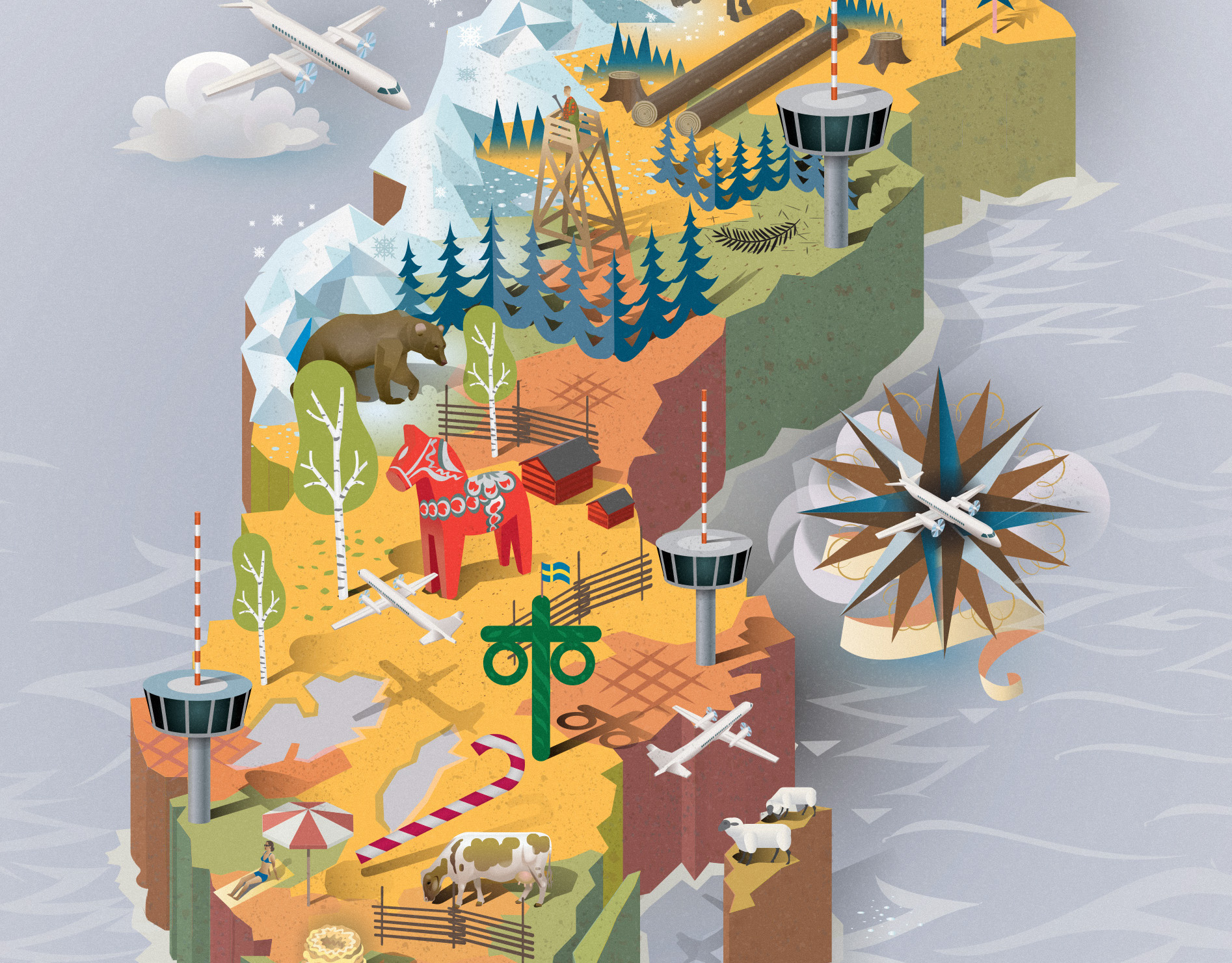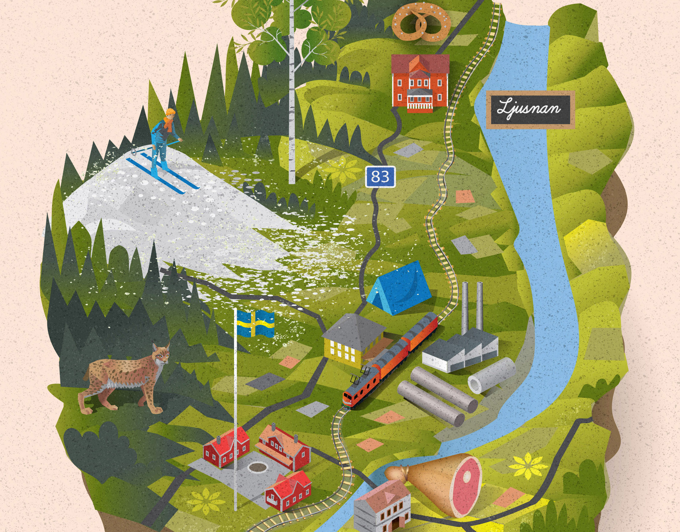 Nils-Petter was commissioned for an infographic illustration showing how waste from pulp and paper industries turns to new land. The illustration was used in SCA's Shape magazine. SCA is a Swedish consumer goods company and pulp and paper manufacturer. Client: SCA.